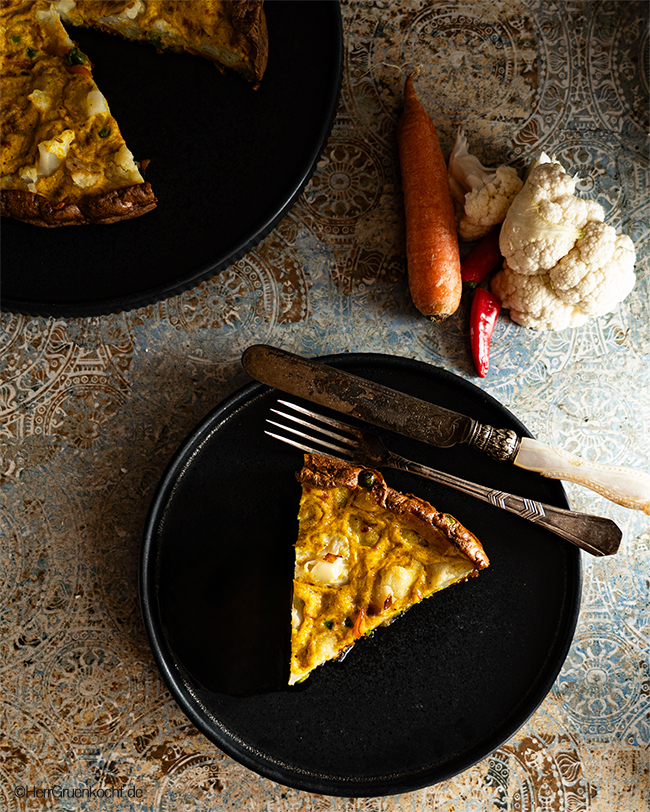 Frittata mit Blumenkohl, Erbsen, Peperoni, Sahne, Käse und Curry