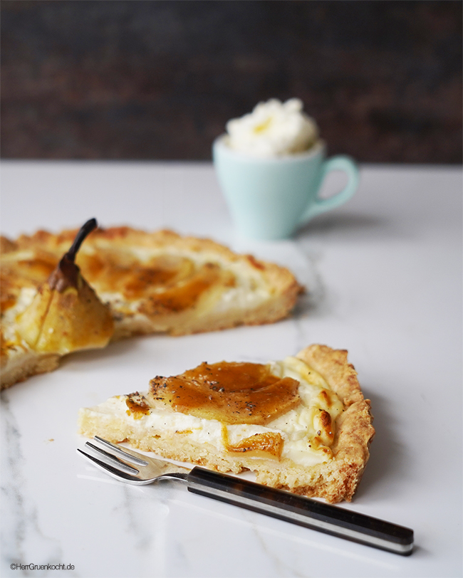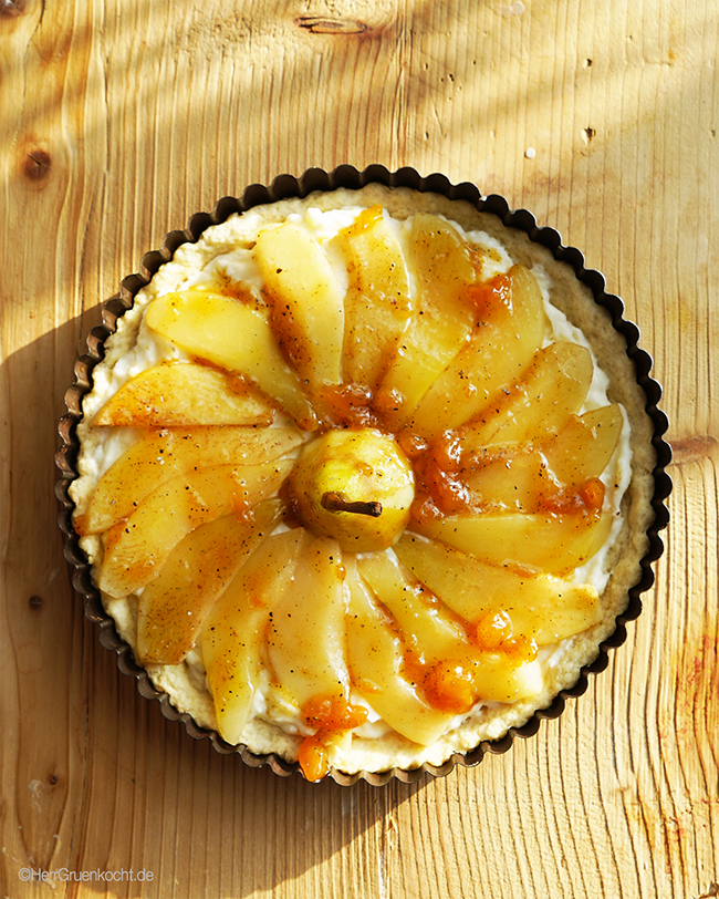 Birnentarte Fleurus – mit Dinkel-Mürbeteig, Quark-Vanille-Crème, und einer Melange aus Aprikosenmarmelade und Kardamom