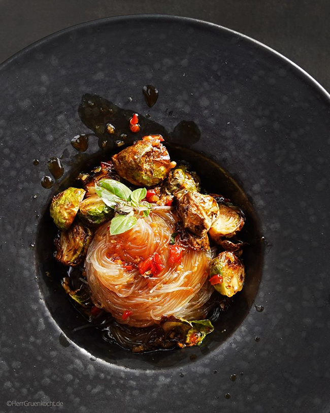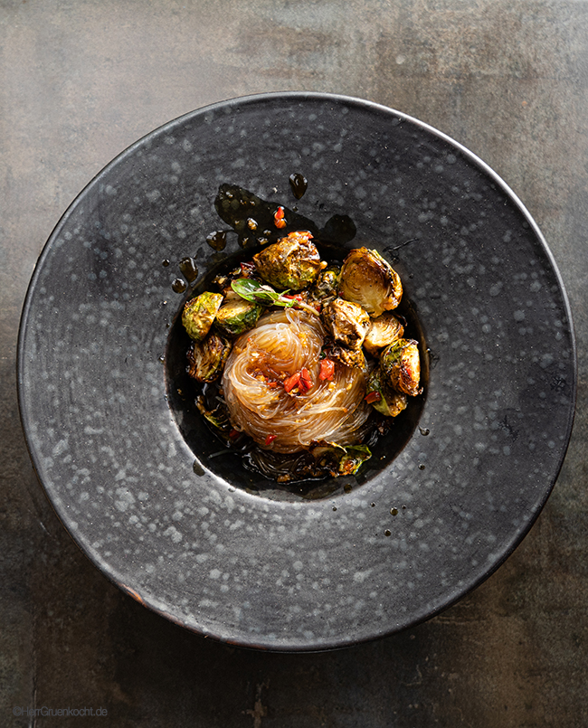 Gerösteter Rosenkohl auf Glasnudeln mit einer spicy Sauce (Ingwer, Peperoni, Sojasoße, Mirin, Knoblauch, Thai-Basilikum)