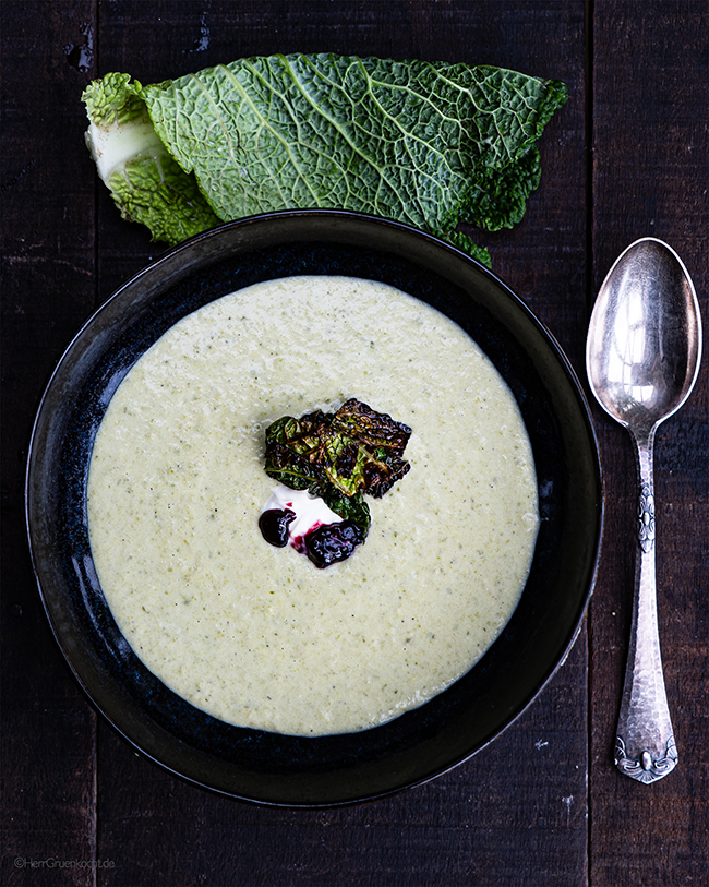 Wirsingcremesuppe mit Wirsingchips, Crème fraîche und schwarzer Johannisbeer-Marmelade